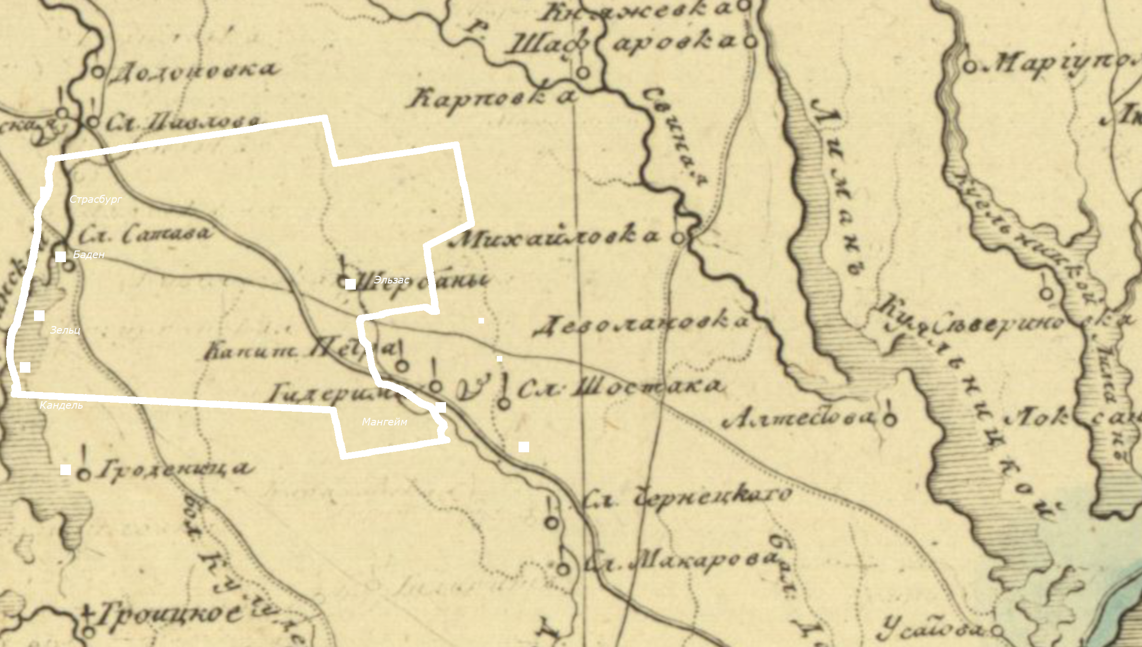 вже значиться як територія німецької колонії Ельзас, яка входила до складу Кучурганського колоністського округу [7], [8].