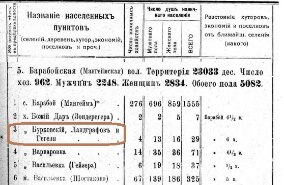 У Списках населених місць від 1917 [6] року є додаткова інформація про хутір Бурківський (Ландграфов і Гегеля).