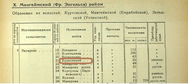 Також відомо, що у 1924 [7], 1926 роках хутір Бурківський входив до Мангеймського (Фр. Енгельського)