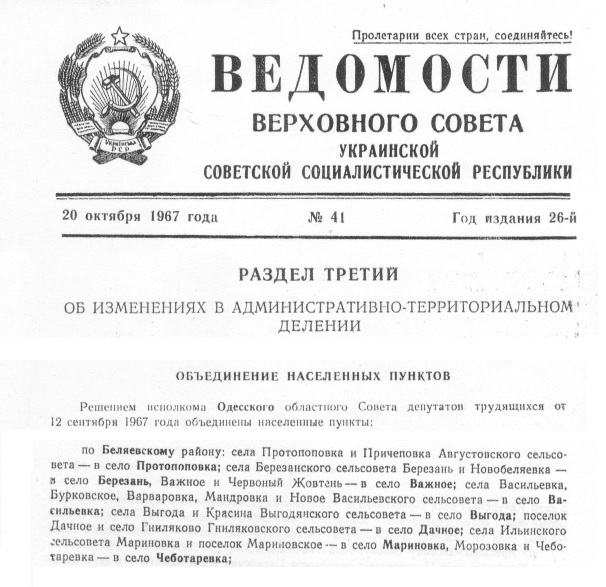 Рішенням виконкому Одеської обласної Ради трудящих від 12 вересня 1967 року було ухвалено рішення об'єднати населені