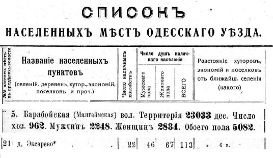 У 1870 році [3] село Екскарово відносилося до 1-го Стану Більчанської волості Одеського повіту.