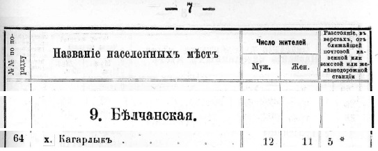 Кагарлык, хут. вл. (при балке Колудеръ, 14 дворов) |