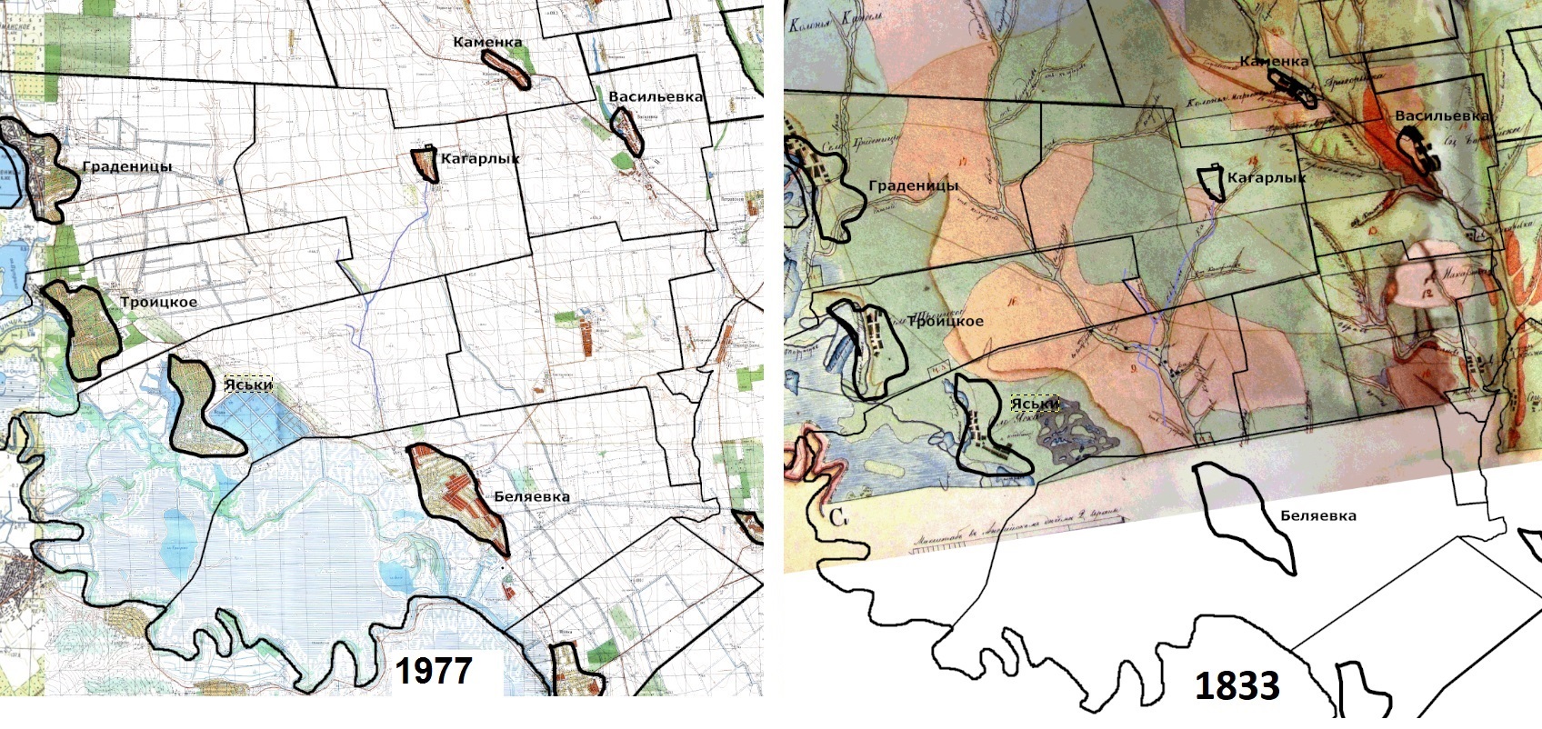 Межевания 1833 г. совмещенный с границами сельских советов до 2020 г.