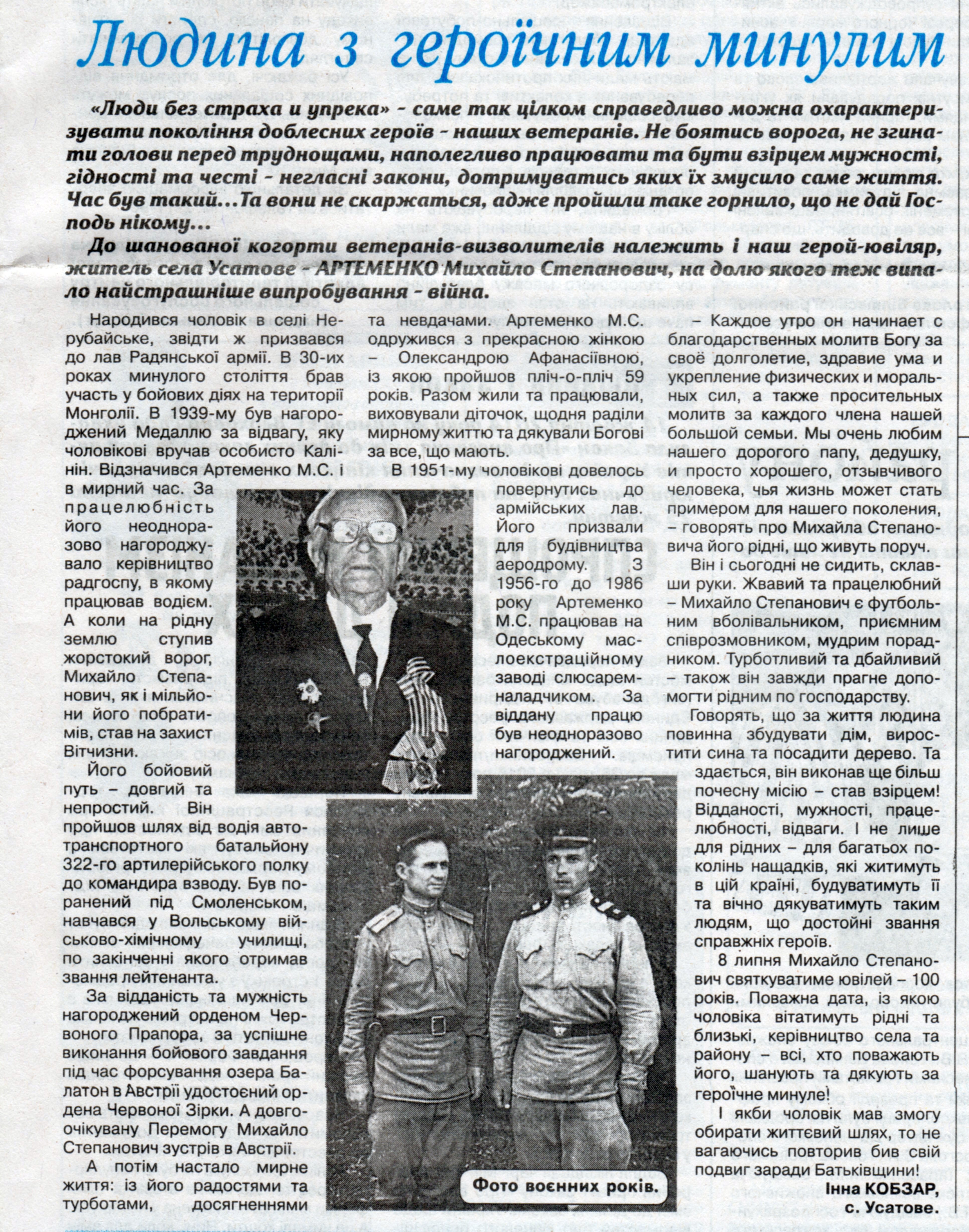«Люди без страха и упрека» - саме так цілком справедливо можна охарактеризувати покоління доблесних героїв - наших ветеранів. Не боятись ворога, не згинати голови перед труднощами, наполегливо працювати та бути взірцем мужності, гідності та честі - негласні закони, дотримуватись яких їх змусило саме життя. Час був такий... Та вони не скаржаться, адже пройшли таке горнило, що не дай Господь нікому... До шанованої когорти ветеранів-визволителів належить і наш герой-ювіляр, житель села Усатове - АРТЕМЕНКО Михайло Степанович, на долю якого теж випало найстрашніше випробування - війна.