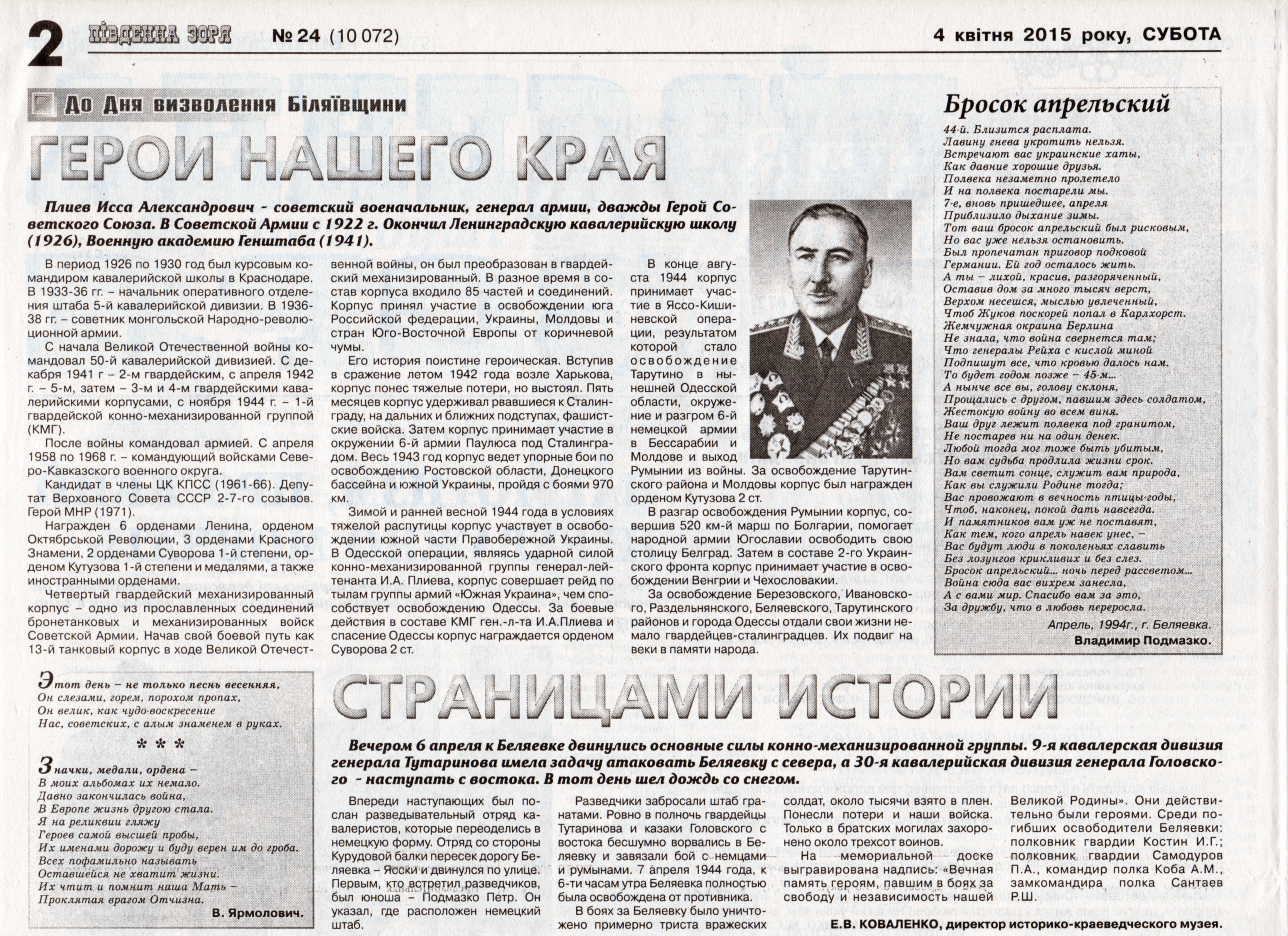 Великой Родины». Они действительно были героями. Среди погибших освободители Беляевки: полковник гвардии Костин И.Г.; полковник гвардии Самодуров П.А., командир полка Коба А.М., зам.командира полка Сантаев Р.Ш.